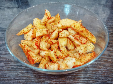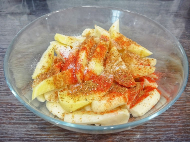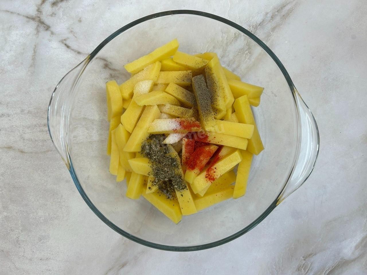 Хорошо промойте картофель, очистите от кожуры и нарежьте на кусочки, какими традиционно нарезают картофель фри. Переложите картошку в глубокую миску, добавьте специи, соль и перец. С помощью ложки всё тщательно перемешайте. Какие специи лучше всего подойдут для картофеля читайте в конце рецепта. Форму для выпечки или противень застелите бумагой для выпекания, а на неё выложите картошку. С выбором пергамента поможет статья по ссылке в конце рецепта.