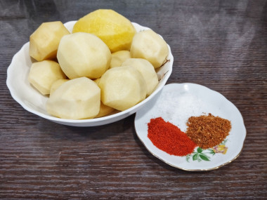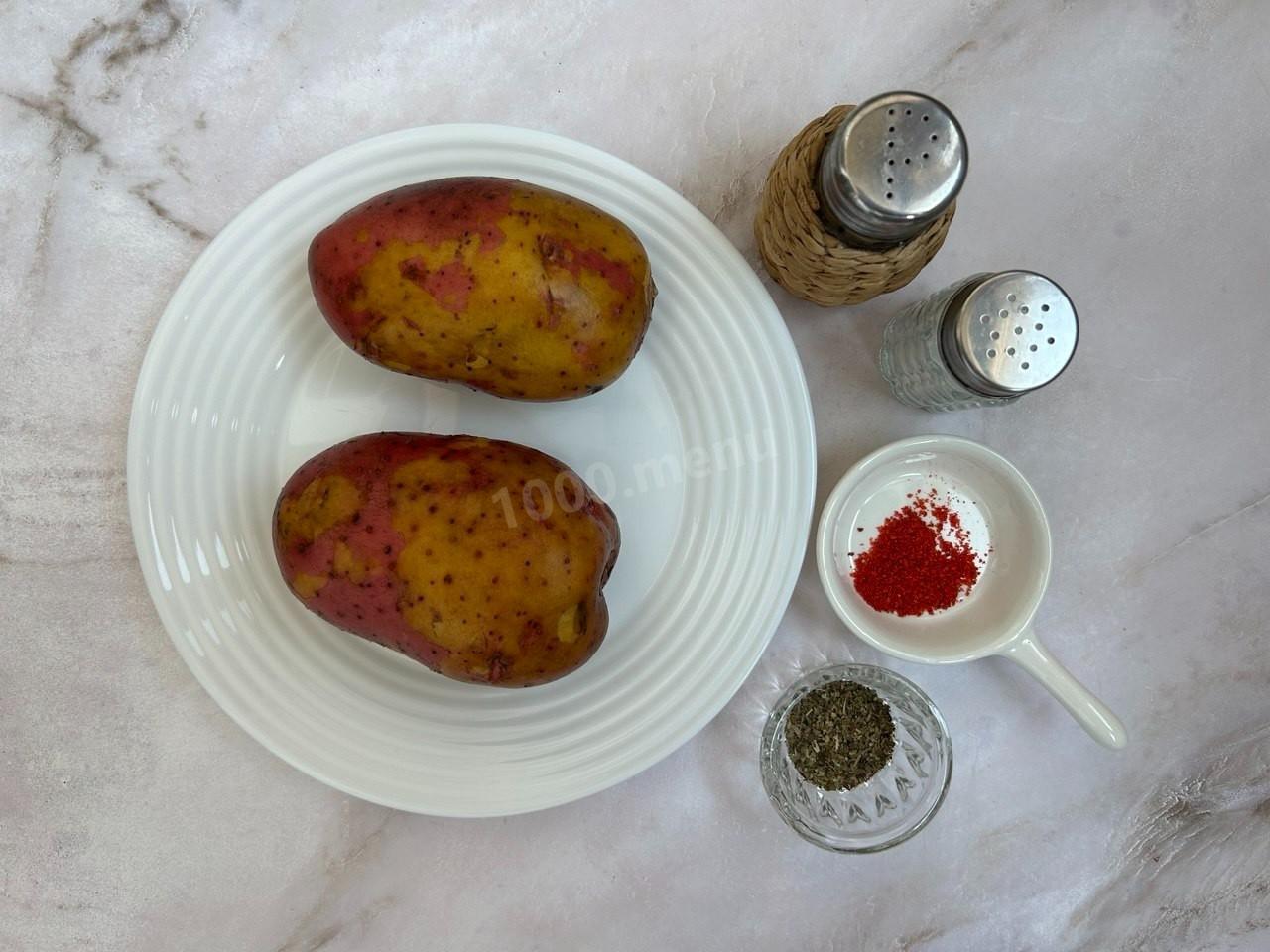 Для начала подготовьте все необходимые ингредиенты. Какую картошку выбрать для фри без масла? Картофель выбирайте с высоким содержанием крахмала, он лучше пропечется. О сорт ах картофеля подробнее читайте в конце рецепта. Специи подойдут любые по вкусу, у мен сушеный базилик. Включите духовку на 180 градусов.
