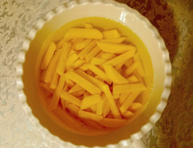 Обычно картофельные дольки перед запеканием мариную в смеси растительного масла и специй. Но картофель фри без масла в духовке предусматривает более диетический вариант. Клубни картофеля я нарезала брусочками фигурным ножом, чтобы они интересней смотрелись. Брусочки промыла от крахмала и обсушила хлопковым полотенцем. Из специй взяла карри и паприку, немного посолила. Запекала картошку в духовке 20 минут. Я думала, что мои брусочки получатся бледными из-за отсутствия масла. Но они получились приятного золотистого цвета. А еще они очень похожи на настоящую картошку фри! Снаружи плотная корочка, а внутри мягкая воздушная картошечка. Специи придают интересный островатый привкус и яркий аромат.