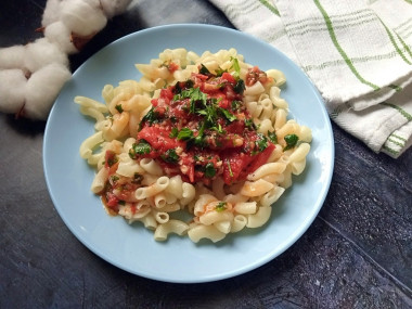 В последнее время мне хочется добавлять чеснок во все блюда, правда домочадцы моего порыва не разделяют. Поэтому макароны по итальянски приготовила для себя лично) Сами макароны у меня в виде рожков, но главное, чтобы они были качественные, тогда и вкус не пострадает. Для подливки взяла замороженные помидоры, чеснок тоже замороженный и уже пропущенный через пресс. Обжарила их на оливковом масле и добавила рубленную петрушку. Аромат во время обжарки просто восхитительный! Долго на огне не держала. Выделившегося сока мне вполне хватило в качестве сочной подливки. Это отличный вкусный и сытный ужин.