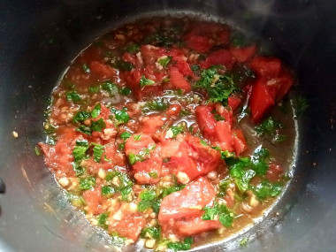 Отправьте помидоры к чесноку в сковороду. Обжаривайте овощи в течение 15 минут на медленном огне до тех пор, пока помидоры не пустят сок. Затем добавьте к помидорам зелень кинзы и петрушки, соль по вкусу и перемешайте. Можно добавить жгучего перца. Обжаривайте всё еще около 3 минут. Выключите огонь. Долго жарить не нужно, чтобы зелень не сгорела, а соус не выпарился.