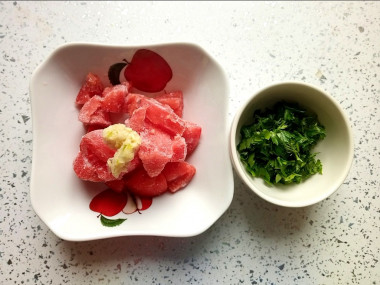 На сковороде разогрейте оливковое масло. Выложите на сковороду измельченный чеснок и обжарьте тего на медленном огне около 5 минут. За это время чеснок должен стать прозрачный и слегка подрумяниться.