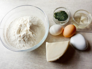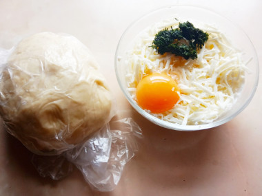 Пока тесто "отдыхает", сделайте начинку. Для нее возьмите мягкий сыр типа адыгейского, сулугуни. Лучше, если сыр будет не слишком соленым. В качестве зелени я использовала петрушку, подойдет также укроп либо зеленый лук.