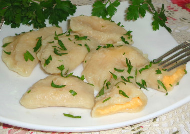 Вот это да! Надо же придумать необычные вареники с сыром! Вареники с сыром довольно легко готовятся. Во время варки сыр внутри вареника плавится, получается оригинальная начинка. Такие вареники понравились не только взрослым, но и нашей малышне, которые не любят творог или мясо. А подавала я такие вареники со сметаной и зеленью. Огромное спасибо за рецепт!