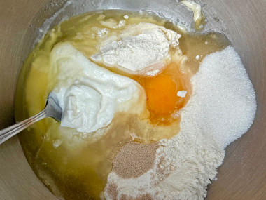 Заложите продукты в ведро хлебопечки в определенном порядке, он указан в инструкции. У меня сначала идут жидкие ингредиенты, а затем сухие. Влейте масло, добавьте сметану и яйца, их лучше предварительно взболтать вилкой. Всыпьте сверху просеянную муку, две-три ложки при этом отложите. На муку в ямку насыпьте сахар, соль и дрожжи. Включите хлебопечь в режим "Тесто" (на разных моделях он называется по-разному, ориентируйтесь по инструкции к вашему прибору).