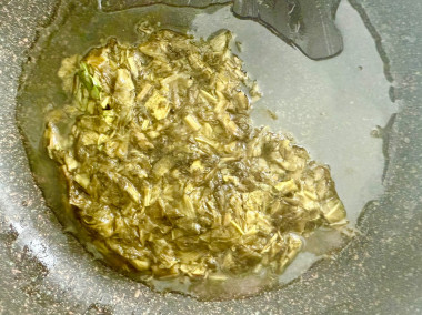 Благодаря тепловой обработке, щавель уменьшается в размере и в пирожки помещается очень много начинки. Во время тушения от щавеля выделилось много влаги, но не хотелось сливать этот кисло-сладкий сок, поэтому добавила немного крахмала и мешала до загущения.