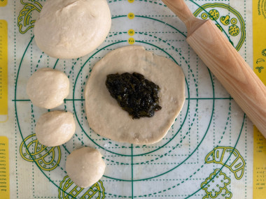 Выложите его на стол и разделите на 8-10 одинаковых частей. Можно сделать и большее количество, но тогда пирожки будут маленькие. Скатайте из каждого кусочка шарик.