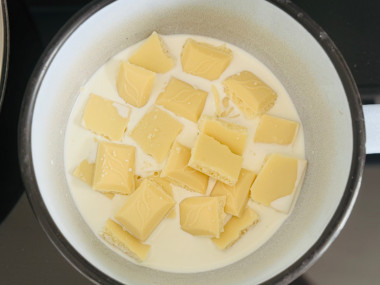 Сливки налейте в сотейник, поставьте на плиту и доведите до кипения. Белый шоколад поломайте на кусочки и выложите в кипящие сливки. Перемешайте до однородности.