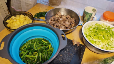 Приготовила на обед суп чорба. Вместо говядины я взяла свинину. Стручковой фасоли у меня не было, заменять её ничем не стала. Варила суп на двух литрах воды.