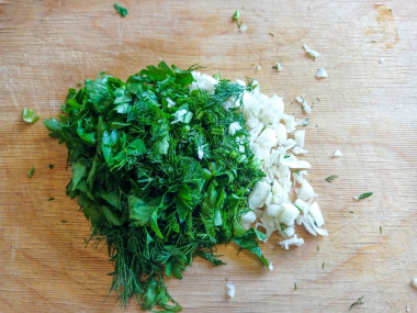 Зелень петрушки и кинзы вымойте в проточной воде, обсушите и нашинкуйте ножом. Чеснок очистите от шелухи, раздавите ножом и мелко порубите. При желании можете измельчить чеснок прессом или на мелкой терке.