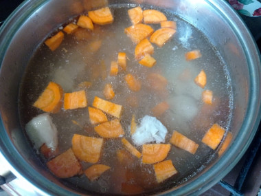 Минут за 15 до готовности мяса положите в бульон морковь. Когда мясо сварится выньте из кастрюли все, кроме моркови. Мясо порежьте кусочками, удалите кости и верните в бульон. Добавьте картошку и фасоль, варите на среднем огне 15 минут.