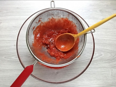 3. Когда ягоды станут прозрачными на вид, а при нажатии сразу деформируются, можно отключать огонь. Накрываем кастрюлю крышкой, оставляем на 20 минут. Затем выкладываем ягоды на сито, аккуратно протираем. Вся мякоть отделится, а косточки и шкурки останутся на сите. Только действовать нужно осторожно, чтобы не обжечься.