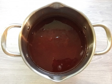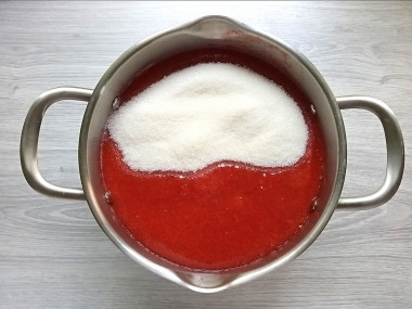 4. В полученную мякоть насыпаем сахар и возвращаем на огонь. Варим примерно 15 минут, только огонь должен быть слабым. Масса булькает и может обжечь руки, так что помешиваем аккуратно. Затем отключаем огонь, даем алычевому пюре остыть, после чего повторно провариваем. Проваривать рекомендуется не менее трех раз, с каждым разом джем будет густеть. Четвертый раз лучше не кипятить, так как цвет может слишком потемнеть, что крайне не желательно.