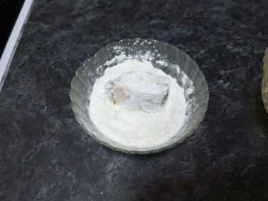Затем хорошо обваляйте в мучной смеси. Для более плотного кляра можно повторить процедуру: еще раз обмакните рыбу в яйцо и еще раз обваляйте в мучной смеси.