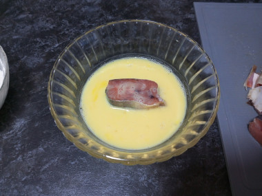 Каждый кусочек рыбы окуните в яичную смесь.