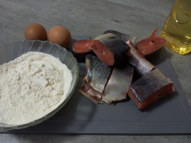 Как сделать горбушу в кляре на сковороде? Подготовьте продукты. Главное в этом блюде качественная рыба, лучше всего охлажденная - в ней содержится гораздо больше полезных веществ. Яйца потребуются крупные, лучше всего домашние. Муку я взяла пшеничную, но можно использовать любую другую муку (рисовую, гречневую), - тем самым получая каждый раз новый вкус. Масло растительное может быть любым, но обязательно рафинированным, чтобы не пригорало на сковороде