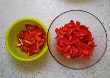 Помидоры тщательно промойте, разрежьте на четвертинки и аккуратно удалите семена с внутренней частью. Мясистые перегородки оставьте. Нарежьте помидоры кусочками среднего размера и сложите их в глубокую тарелку.