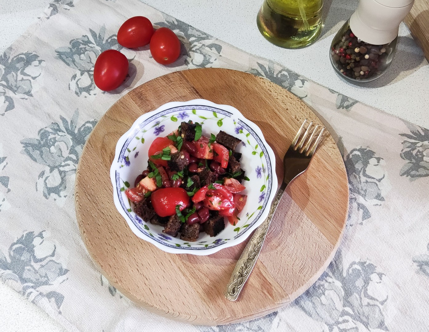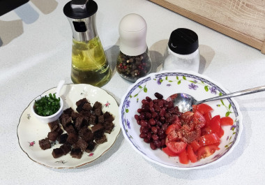 Для салата с фасолью и помидорами я взяла красную консервированную фасоль. Помидорки у меня были коктейльные, поэтому я их нарезала небольшими кусочками. Масло добавила оливковое, перец свежемолотый. Сухарики для салата сделала из ржаного хлеба, подсушив его на сковороде. Зелень добавила вместе с сухариками перед подачей. Несложное блюдо из доступных продуктов, но с прекрасным вкусом. Рекомендую этот рецепт салатика.