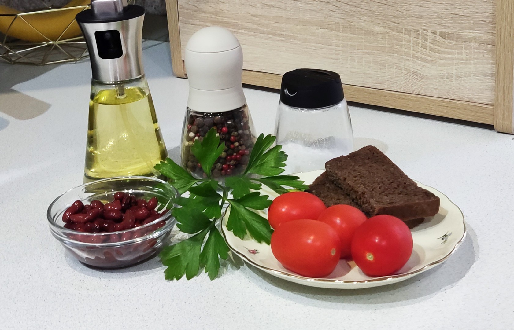 Сухарики добавляйте к помидорно-фасолевой смеси непосредственно перед подачей, чтобы они не размокли раньше времени. Зелень петрушки промойте, обсушите и мелко нарежьте. Добавлять зелень можно на любом этапе приготовления салата. Приятного аппетита!