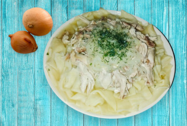 Отварила курицу. В этом же бульоне сварила сочни, отдельно приготовила лук. Когда всё было уже готово, сочни положила на блюдо, сверху курицу, а потом лук, и посыпала измельчённым укропом, чтобы было красиво.