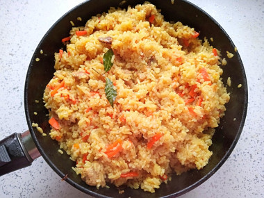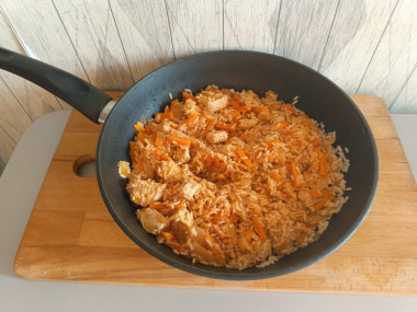 В последнее время мне понравилось готовить плов на сковороде. При этом способе рис пропаривается равномерно, да и в общем блюдо готовится быстрее. Лук я по привычке нарезала мелко, а вот морковь крупными брусочками. Мясо с овощами готовилось минут тридцать. С рисом еще примерно двадцать минут. Люблю плов за быстроту приготовления) Зиры у меня не было, но я добавила куркуму. Благодаря ей плов с индейкой на сковороде получился желтеньким, аппетитным. Перец люблю добавлять прямо из мельнички, у меня в ней несколько видов перца. Получается не сильно остро, но зато прекрасный аромат. Плов получился сочным, сытным, вкусным! Благодарю за рецепт!
