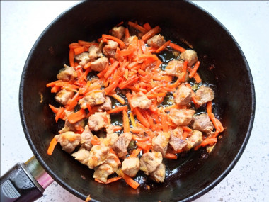 Нарезанные овощи добавьте в сковороду к мясу. Перемешайте и обжарьте все вместе еще 2-3 минуты. От овощей появится характерный аромат.