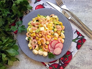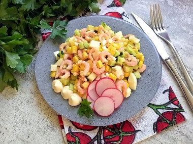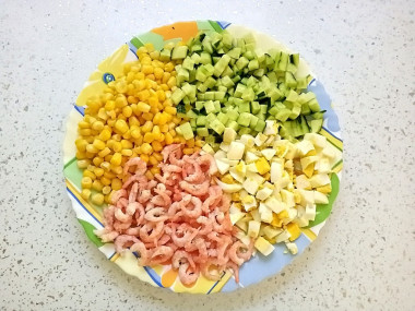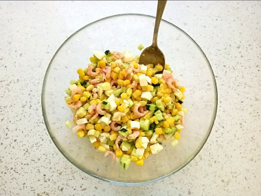 У огурца была грубая шкурка, поэтому частично ее срезала. Огурец и яйца нарезала кубиками. Кукурузу взяла сладкую, она хорошо сочетается с креветками. Салат заправила небольшим количеством майонеза и слегка посолила.