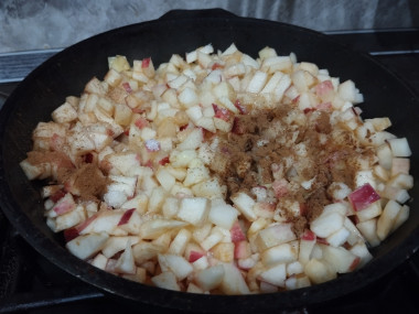 Потушите начинку на среднем огне около 7-8 минут, пока яблоки не пустят сок и он не закарамелизируется с сахаром.