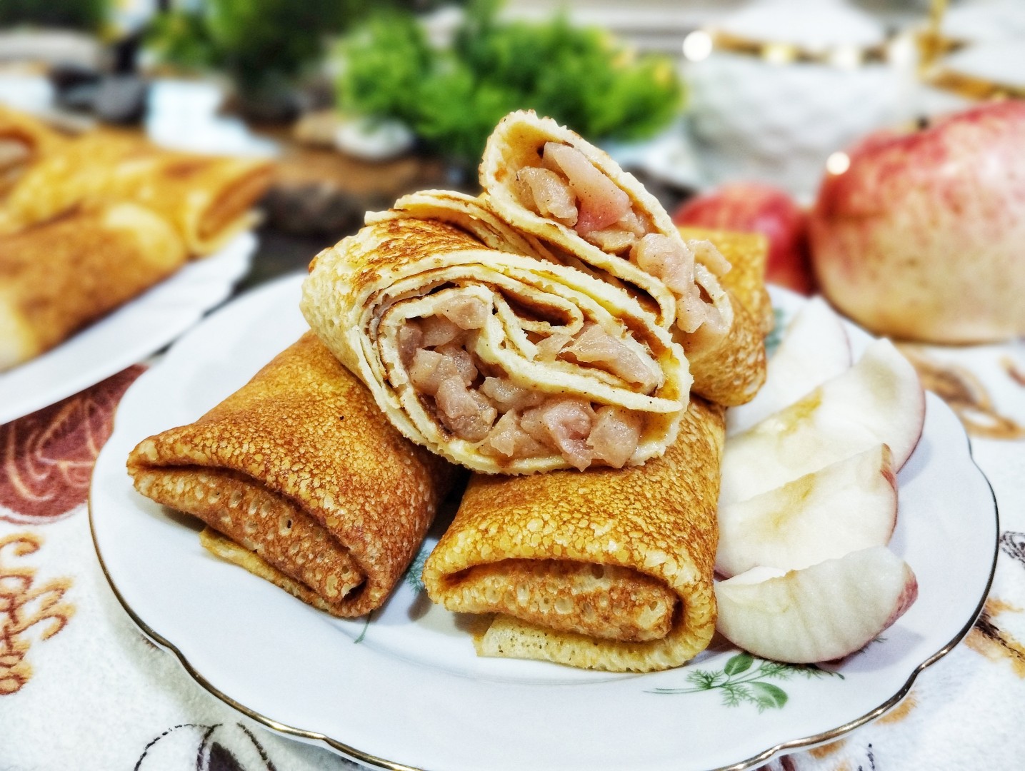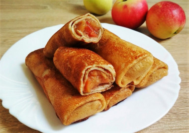 Скрутите блин рулетом или сложите конвертом, стараясь, чтобы не оставалась отверстий, иначе яблочная начинка выпадет на сковороду при жарке.
