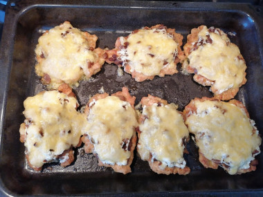Очень замечательный и вкусненький рецепт приготовления курочки. Делаю так давно, немного изменила, после обжарки котлеток сверху положила жареные с луком грибы, сетку майонезом и сыр.Получается ещё вкуснее и празднично .