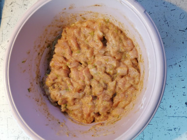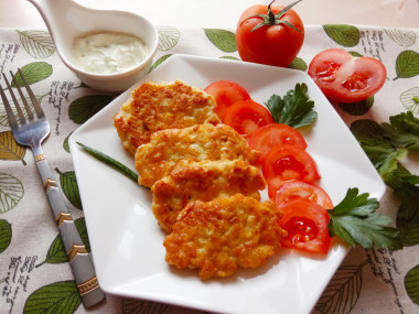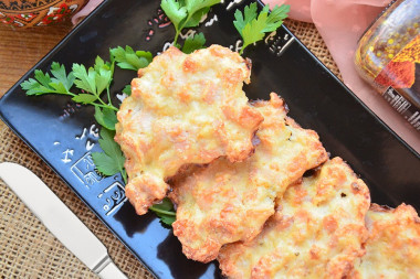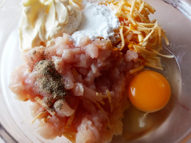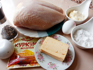 Как сделать сочные котлеты из куриной грудки с сыром? Возьмите следующие продукты: куриную грудку, твердый сыр, яйцо, майонез, крахмал (или муку), соль, куркуму (или свою любимую приправу), масло для жарки.
