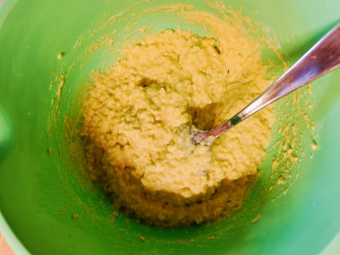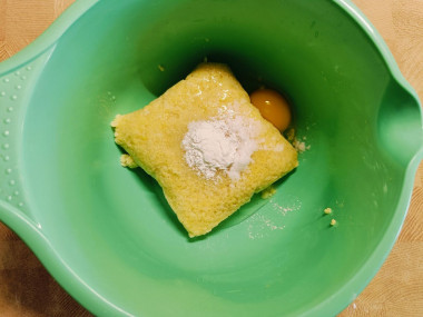 Переложите кашу в миску, вбейте в нее яйцо. Всыпьте сахар, пару ложек муки и разрыхлитель. Не добавляйте сразу всю муку, смотрите по густоте каши. В зависимости от качества муки её может понадобиться чуть больше или чуть меньше. О муке и её свойствах подробнее можно прочитать в отдельной статье, ссылка в конце рецепта.
