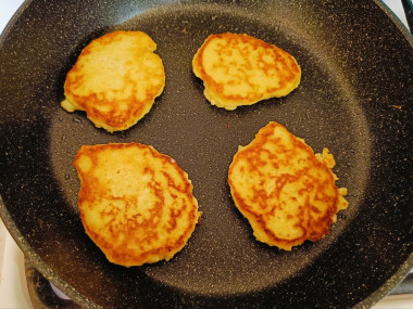 Жарьте их на одной стороне до румяности, затем переверните на другую. Готовые оладьи снимите на тарелку. Перед следующей партией можете уже не смазывать сковородку — начнет работать масло в тесте. Пожарьте таким образом оладьи из всего теста.