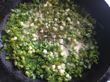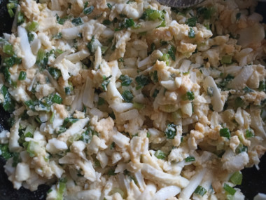 Смешать лук и яйца. Посолить, поперчить по вкусу.