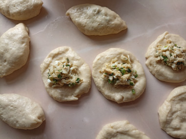 Отрезать от теста четвертую часть. Скатать ее в колбаску. Отрезать от колбаски небольшой кусочек. Раскатать его. Слепить пирожок.