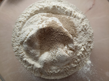 Муку просеять, всыпать сухие дрожжи. Дрожжи смешать нужно с мукой таким образом, чтобы они жидкости не касались.
