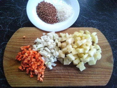 Приготовим остальные ингредиенты: картошку, морковь, лук, кусочек сала, подсолнечное масло, гречку и рис, зелень петрушки и укропа, соль, перец горошком и лавровый лист.