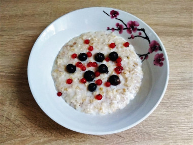 Переложите кашу в тарелку, пока она еще горячая. Украсьте замороженными ягодами. Если за окном лето, используйте свежие ягоды и фрукты. Также можно посыпать кашу разнообразными немного измельченными орехами. Приятного аппетита!
