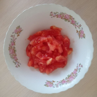 Очистите помидоры от кожуры, вырежьте из них сердцевинки и нарежьте мелким или средним кубиком.