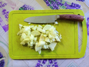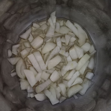 Пока томаты в воде, очистите луковицу, промойте и нарежьте мелким кубиком. Прогрейте оливковое масло в казане или сотейнике с антипригарным дном, пассеруйте в нем луковую нарезку на слабом огне до прозрачности или золотистого цвета, время от времени перемешивая. С выбором идеальной посуды для супа поможет отдельная статья, ссылка в конце рецепта.
