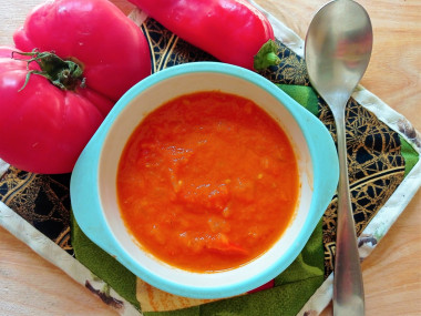 Решила приготовить на обед классический томатный суп-пюре. Делала на 4 порции. Кроме лука и помидоров добавила ещё один небольшой болгарский перец.