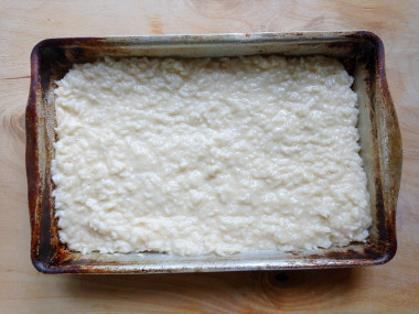 Форму для запекания смажьте сливочным маслом. Посыпьте ее дно манкой, чтобы запеканка легко вынулась. Выложите в форму рисовую кашу, равномерно распределите ее, верх разровняйте лопаткой. Разогрейте духовой шкаф до 180 градусов, поставьте в него форму с запеканкой. Выпекайте ее около 25 минут. Готовая запеканка должна покрыться аппетитной румяной корочкой.