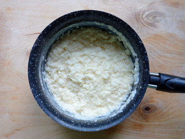 Добавьте в кастрюлю с рисом соль и сахар по вкусу, залейте его молоком и водой и поставьте на небольшой огонь. Можно сварить кашу только на воде, но из молочной каши запеканка будет вкуснее. Периодически кашу перемешивайте, чтобы рис не прилип и не пригорел ко дну кастрюли. Когда рис хорошо разбухнет, а жидкости станет мало, огонь выключите. Добавьте в кашу сливочное масло, хорошо перемешайте, накройте кастрюлю крышкой и оставьте на 20 минут.
