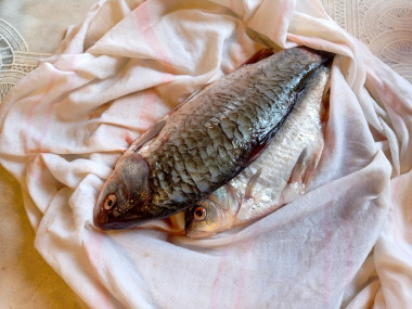 Все ингредиенты взяла согласно рецепту, кроме рыбы. Вместо карпа использовала двух небольших карасиков. Поскольку карась - рыба достаточно костлявая, то варила его, завязанным в чистую хлопчатобумажную ткань, чтобы кости не попали в бульон, если рыба сильно разварится. Из готовой рыбы вынула кости и вернулась её уже в готовый суп.