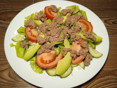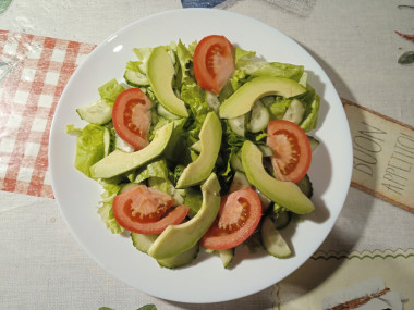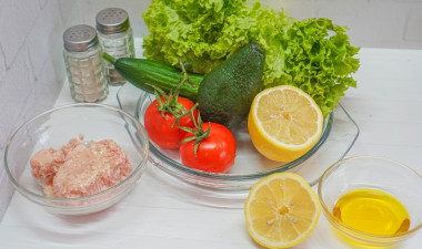 Очень люблю салатики. Нашла на сайте рецепт - салат тунец с авокадо и решила приготовить. Тунец консервированный купила измельчённый в масле. Также взяла свежие овощи и листовой салат. Процесс приготовления очень простой и быстрый. Авокадо сначала разделила пополам, вынула косточку, затем почистила и нарезала ломтиками. Огурец и помидор порезала по описанию в рецепте. От себя ещё добавила мелко порубленный чеснок. Уложила свежие листья салата на блюдо. Сверху выложила овощи, а в конце добавила тунец и немного поперчила. Так как тунец достаточно солёный, я в салате соль не использовала. И масло не добавляла, так как тунец уже был с маслом. Получился шикарный салат на скорую руку. Все ингредиенты отлично дополняют друг друга. Рыбный салат получился ароматный, сытный, яркий и очень аппетитный. Подавала как самостоятельное блюдо на лёгкий ужин. Замечательный рецепт! Большое спасибо автору)