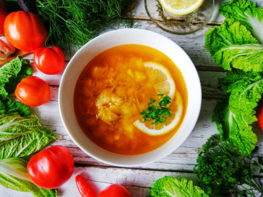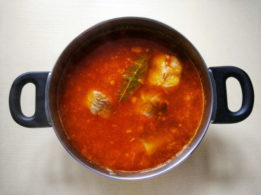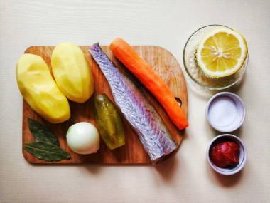 Лук и морковь обжарила до мягкости, положила в сковородку томатную пасту, немного воды, потушила зажарку две минуты и выложила в бульон. Через две минуты добавила натертый соленый огурчик, лавровый лист и соль, оставила суп варится на пять минут. Перед подачей добавила в тарелку дольку лимона. Вышло очень ароматно! Рыба и овощи стали мягкие, бульон насыщенный с приятной кислинкой.