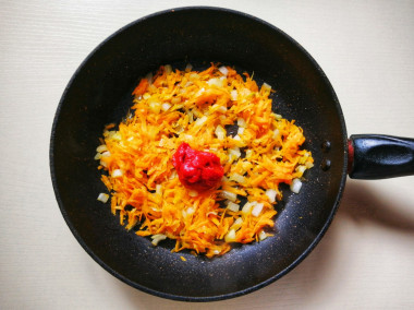 На сковороде разогрейте растительное масло. О том, как правильно выбрать масло, читайте в отдельной статьях, ссылка в конце рецепта. Выложите на сковородку измельченные лук и морковку. Как только лук станет прозрачным, а морковка мягкой, добавьте к овощам томатную пасту, перемешайте и тушите всё около минуты. Добавьте немного (1-2 ст.л.) воды, перемешайте и выключите огонь. Зажарка для солянки готова.