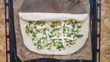 Стол припылите мукой. Готовое тесто раскатайте в прямоугольный пласт.