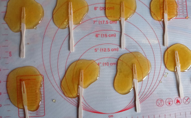7. В каждый круг помещаем палочку (можно шпажку). Оставляем до полного остывания, примерно на 20-30 минут. За время остывания леденцы затвердеют.