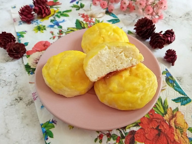 Тесто мне понравилось, оно не очень липкое. Сырники формировала просто руками, даже не смачивала и не подпыляла мукой. Выпекала 20 минут при 180°С, не переворачивала. Донышко хорошо поджарилось. А для румяного верха можно включить гриль за 5 минут до готовности.
